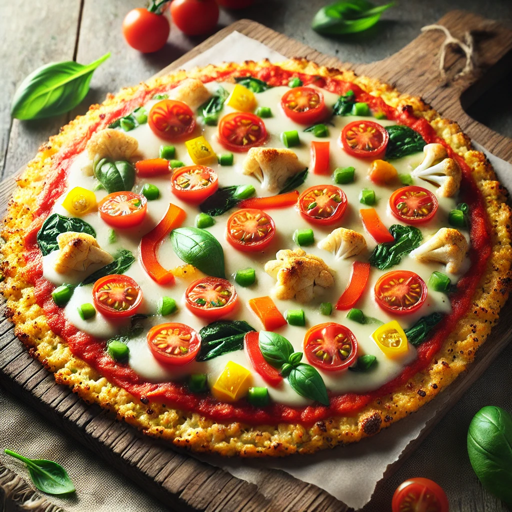 콜리플라워를 잘게 다져 도우로 사용하고, 토마토 소스, 치즈, 채소 등을 올려 구운 글루