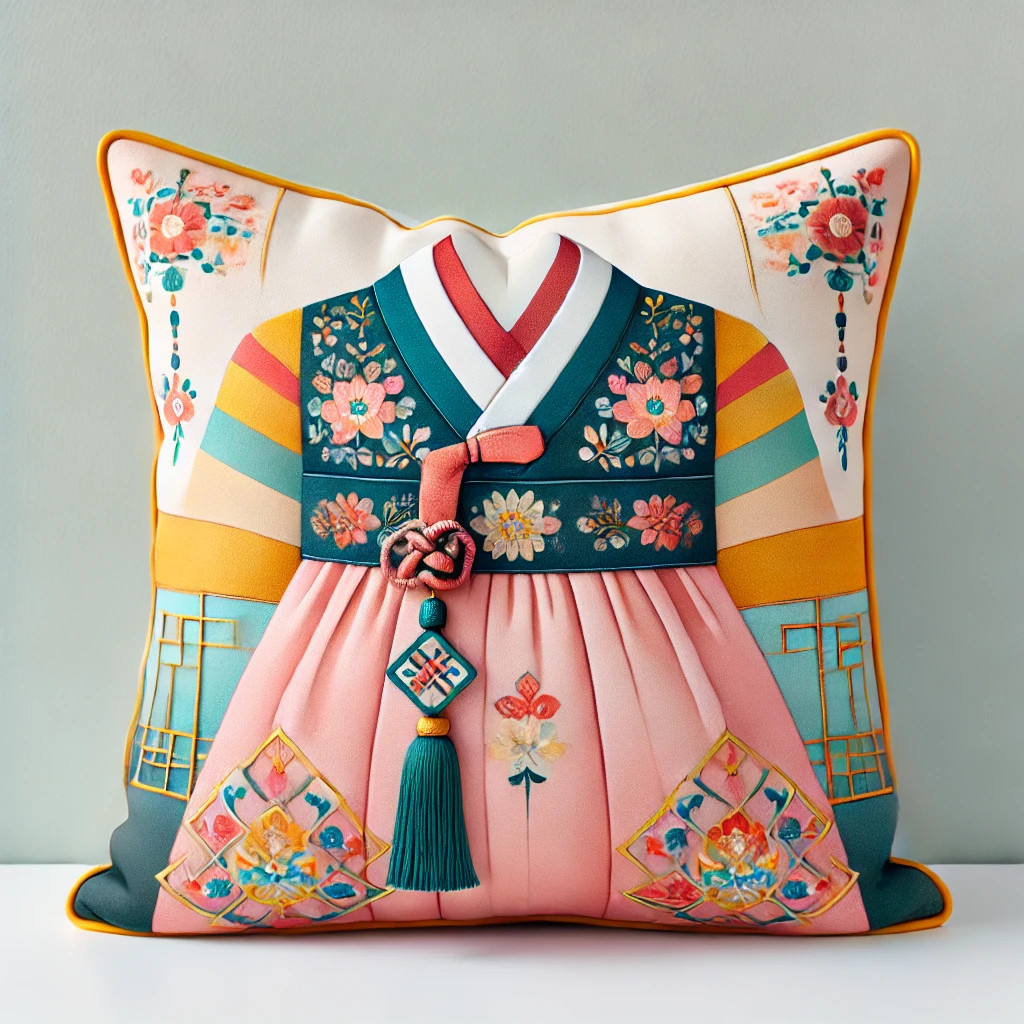- 이미지: 한복의 색상과 패턴을 반영한 쿠션 커버. 다양한 색상(예: 연분홍, 청록, 노랑)과 전통 매듭으로 장식됨.