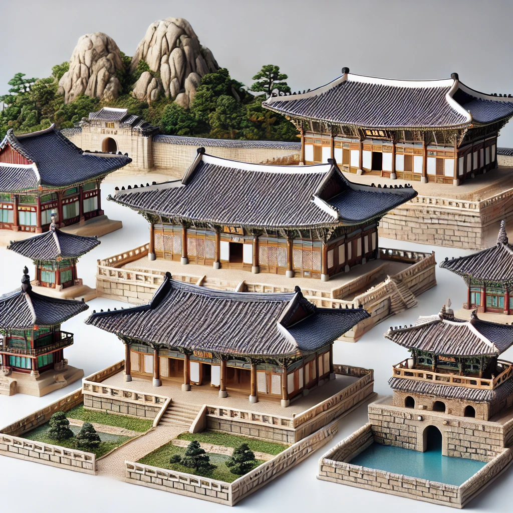 - 이미지: 경복궁, 불국사, 석굴암 등의 주요 건축물 미니어처 모형 세트. 각 건축물의 주요 디테일이 정교하게 표현됨.