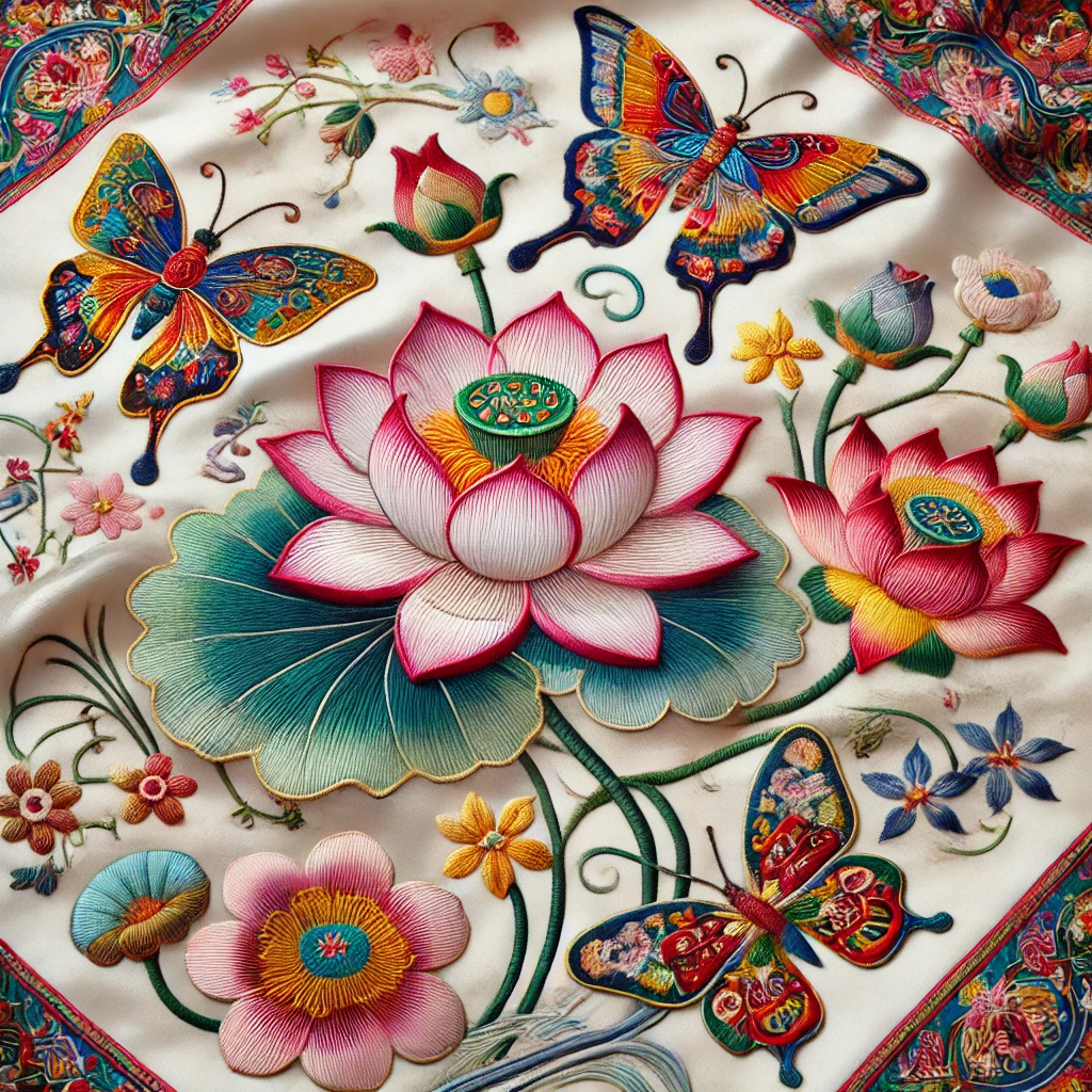 - 이미지: 전통 자수 문양(연꽃, 나비 등)이 새겨진 실크 스카프. 부드러운 소재에 다양한 색상으로 디자인됨.