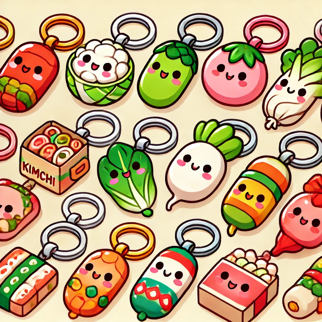 이미지: 김치의 모양을 귀엽고 만화적으로 표현한 열쇠고리. 다양한 종류의 김치(배추김치, 깍두기 등)가 각각 다른 색상으로 디자인됨.