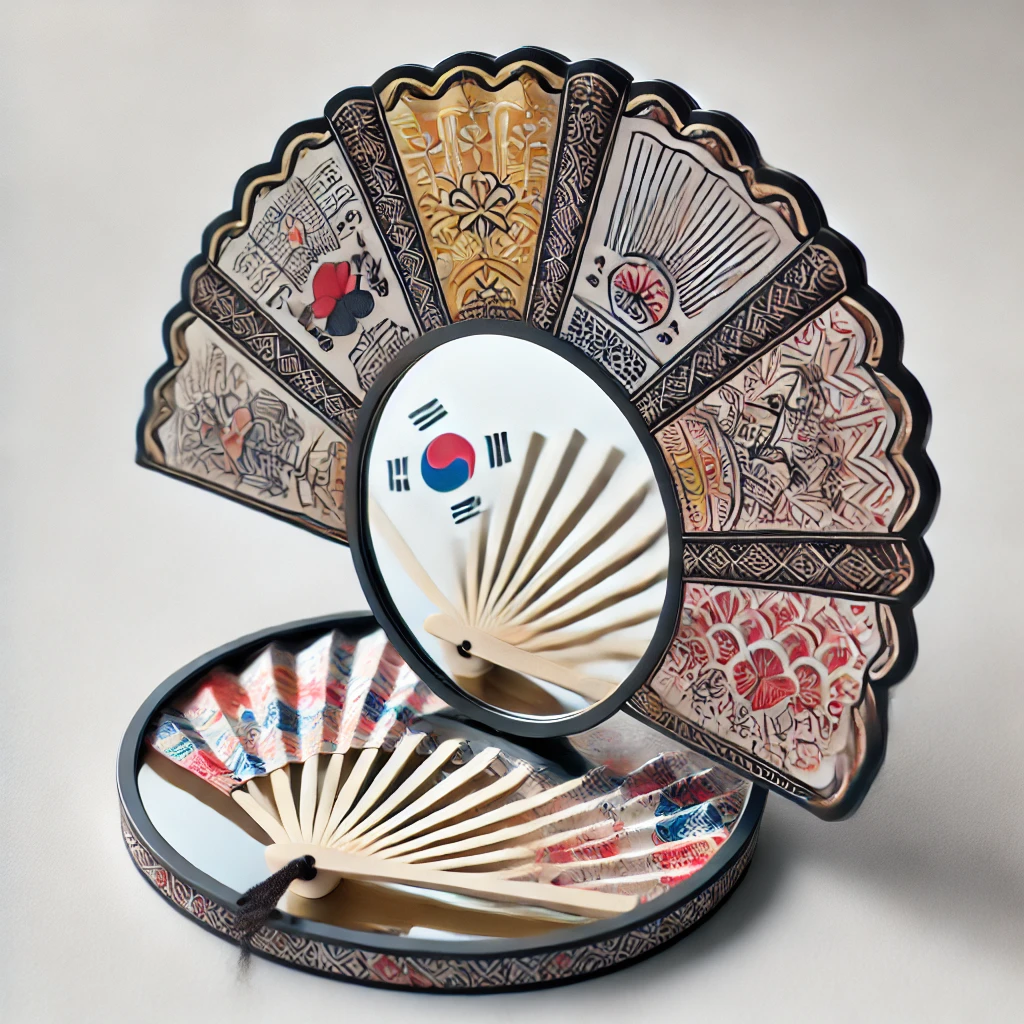 - 이미지: 전통 부채 모양을 본뜬 휴대용 거울로, 한쪽에는 거울이, 다른 한쪽에는 전통 문양이 프린트되어 있음.