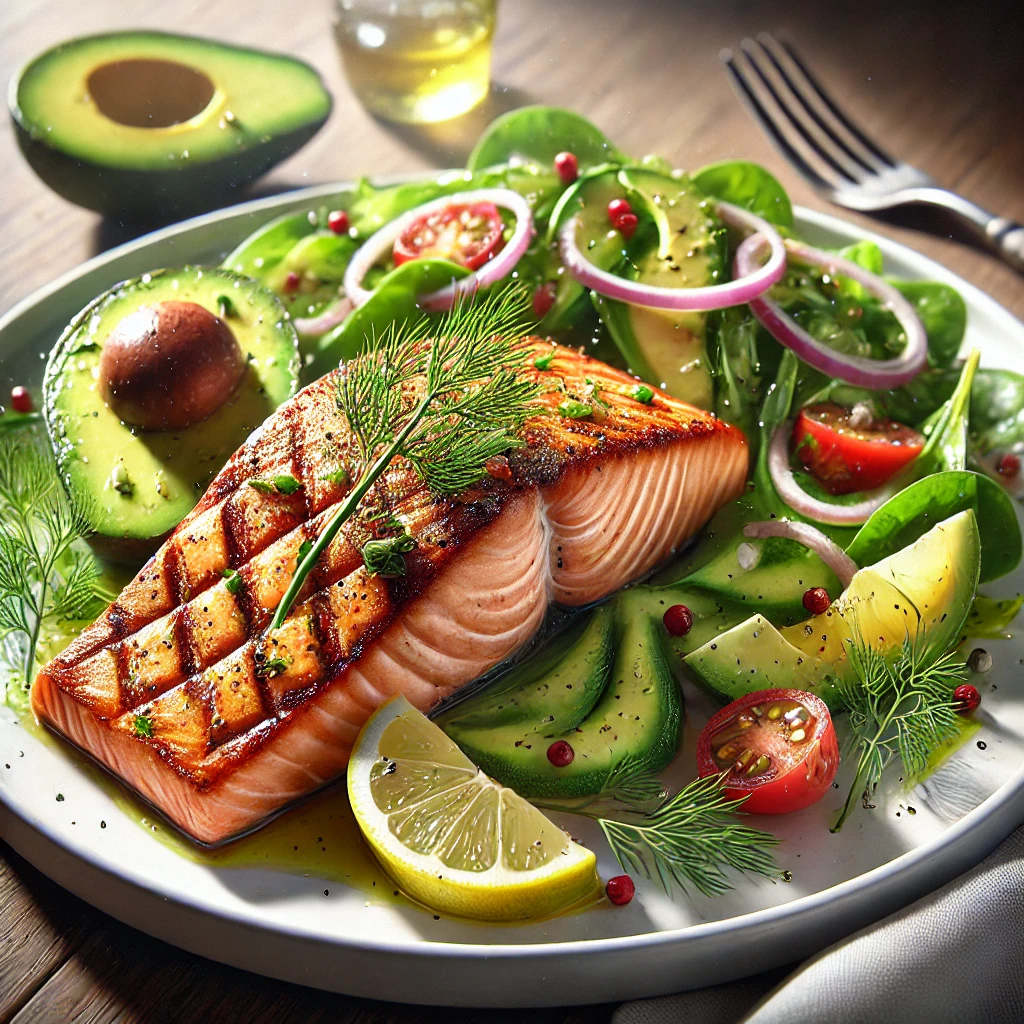 연어는 오메가-3 지방산이 풍부해 염증을 줄이고 면역력을 증진합니다. 아보카도는 비타민 E가 풍부해 항산화 작용을 돕습니다.