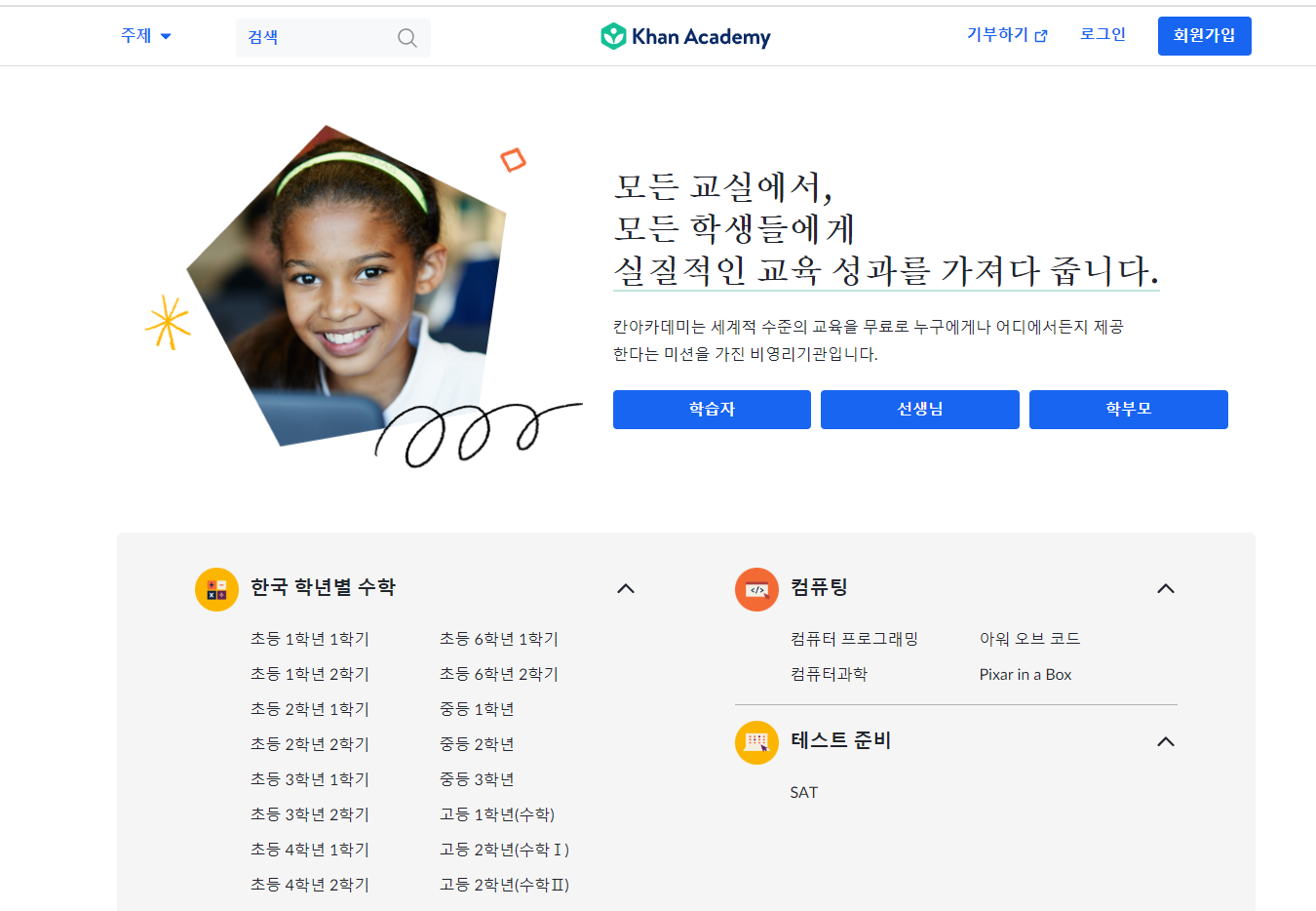 유다시티는 기술과 관련된 무료 강좌를 많이 제공하는데, 특히 프로그래밍, 데이터 과학, 인공지능 등의 분야에서 인기가 많습니다. 유다시티는 실습 중심의 프로젝트 기반 학습을 강조하며, 학습자들이 실제로 기술을 적용해 볼 수 있도록 도와줍니다. - 칸아카데미(Khan Academy)