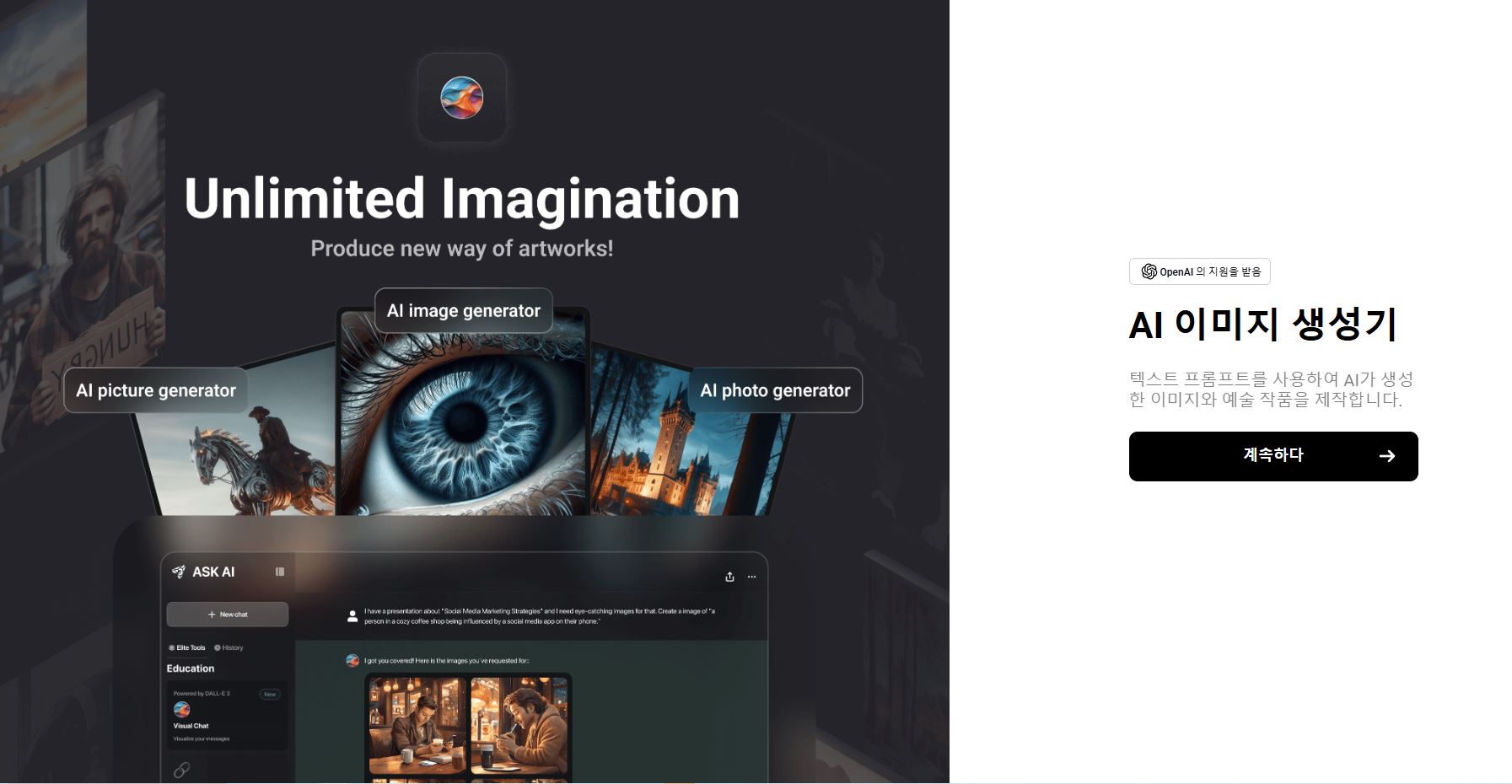 - AI 이미지 생성기 사용: 템플릿 중 ‘AI 이미지 생성기’ 옵션을 선택한 후 원하는 프롬프트를 입력합니다.