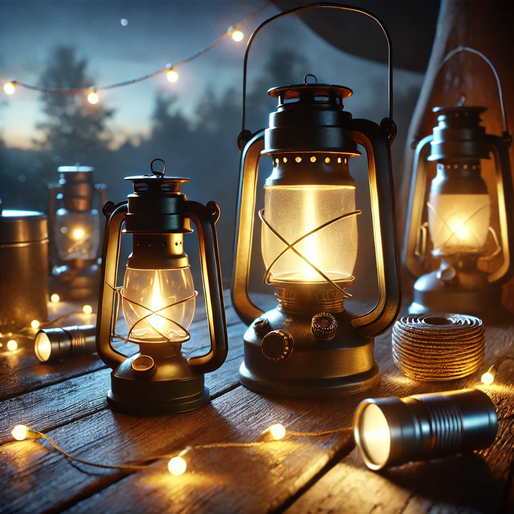 - 랜턴: 휴대용 랜턴은 캠핑에서 가장 많이 사용되는 조명입니다. 배터리 또는 충전식 랜턴을 사용할 수 있으며, 사용 시간이 긴 제품을 선택하는 것이 좋습니다.