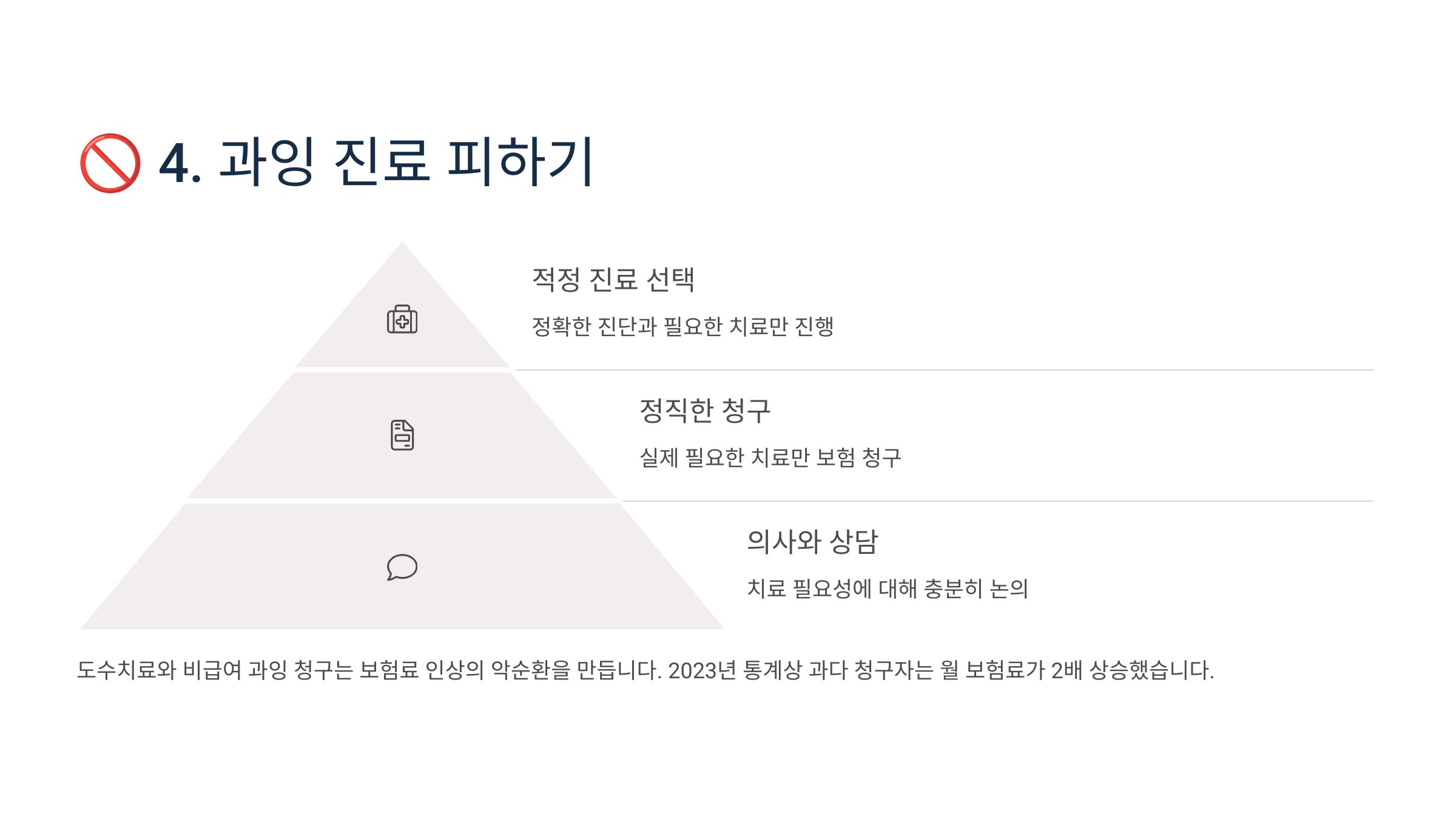보험금 많이 타기 위해 꼭 필요하지 않은 치료나 검사를 받는 경우가 있어요. 이런 과잉 진료는 결국 전체 보험 가입자의 보험료를 높이는 원인이 되죠.