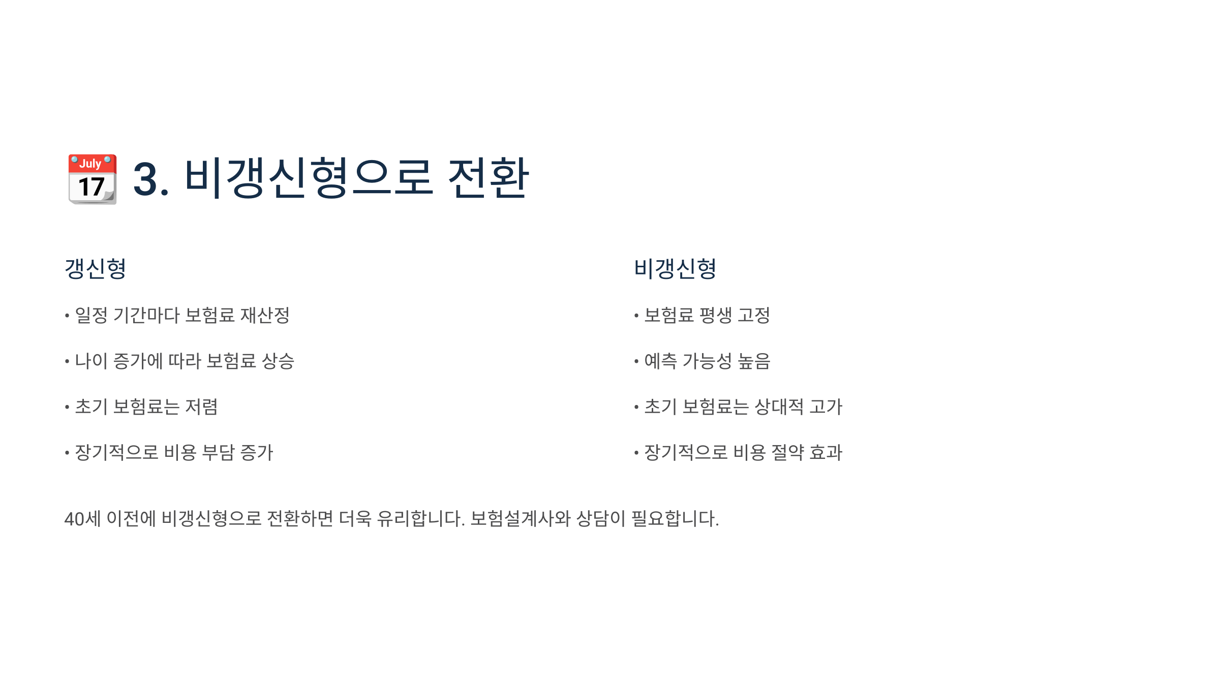 장기적인 재무 계획을 고려한다면, 비갱신형 보험으로의 전환도 진지하게 고려해볼 만한 선택이에요. 📘