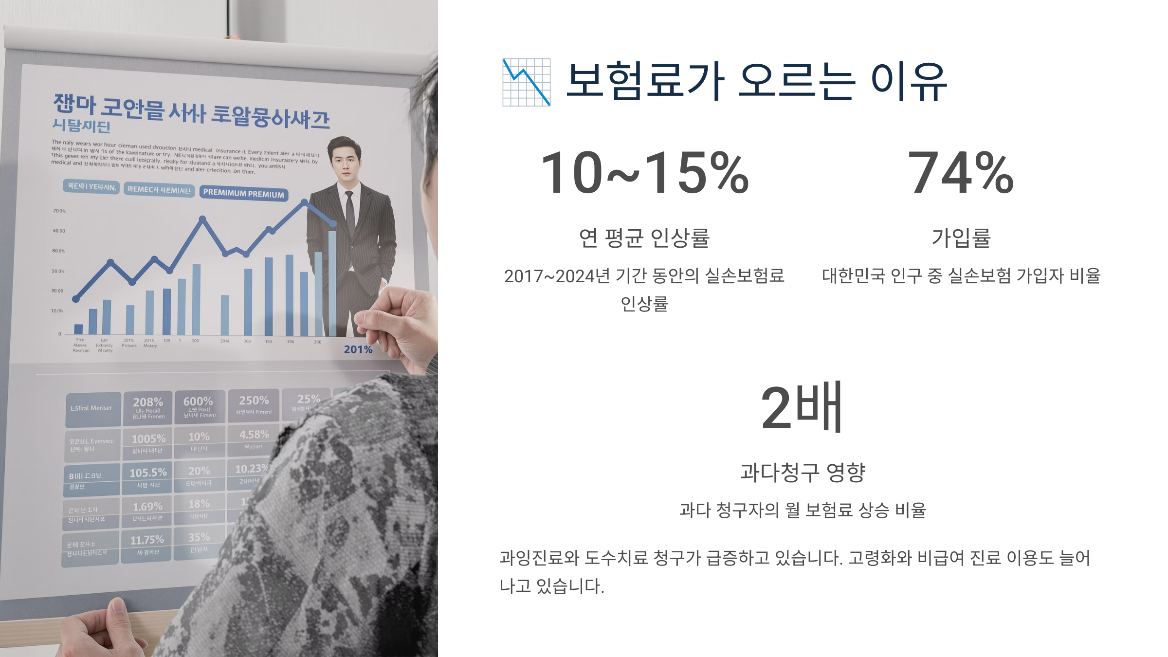 보험료 인상의 가장 큰 원인은 보험금 지급이 많아졌기 때문이에요. 특히 일부 가입자들의 과잉 진료와 도덕적 해이가 전체 보험료 상승으로 이어지고 있어요.