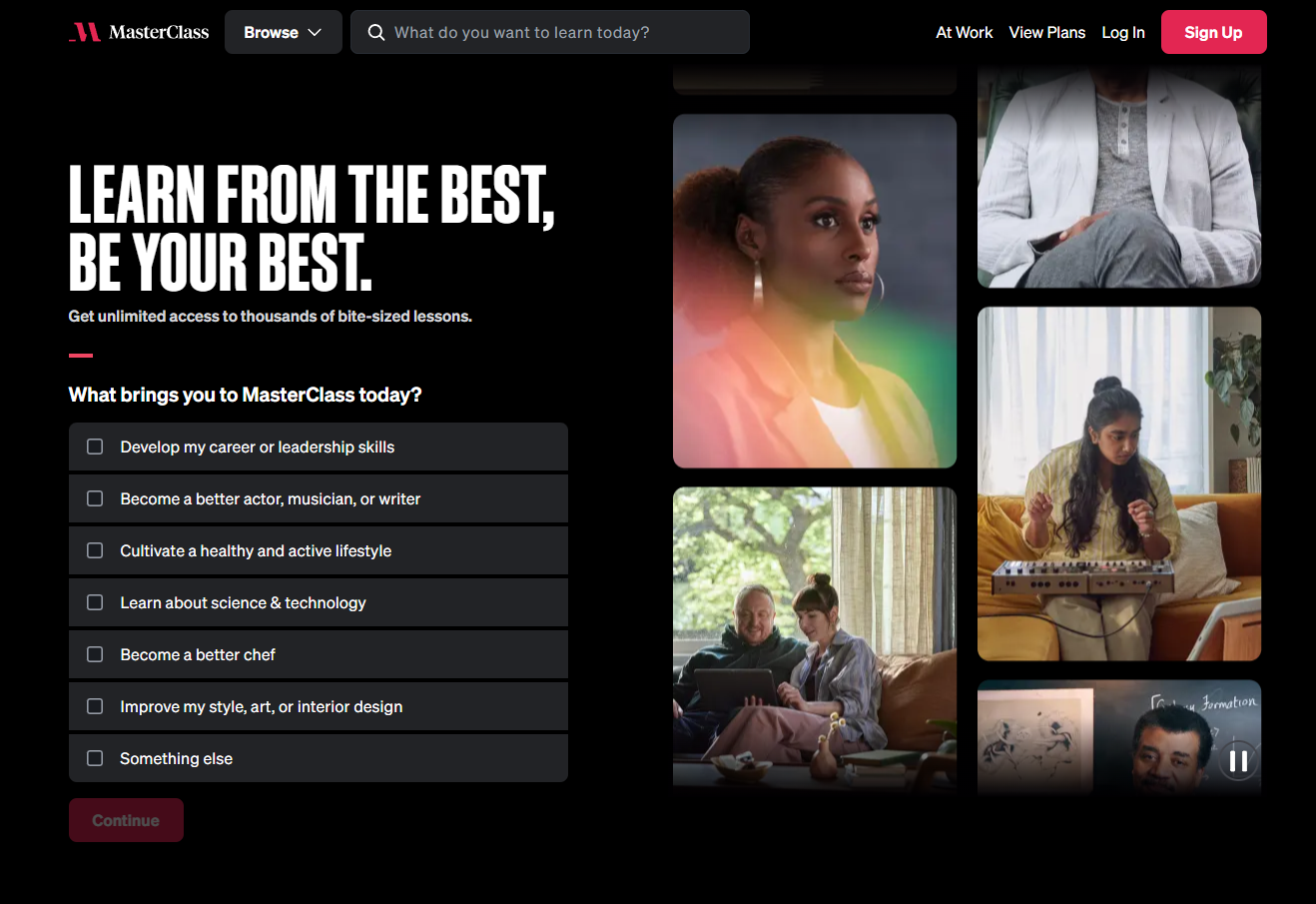 MasterClass는 유명인이나 업계 최고 전문가가 강의를 진행하는 온라인 학습 플랫폼입니다. 유명 셰프, 감독, 작가 등 유명 인사들의 강의를 통해 특정 분야에 대한 통찰을 얻고자 하는 사람들에게 적합합니다.