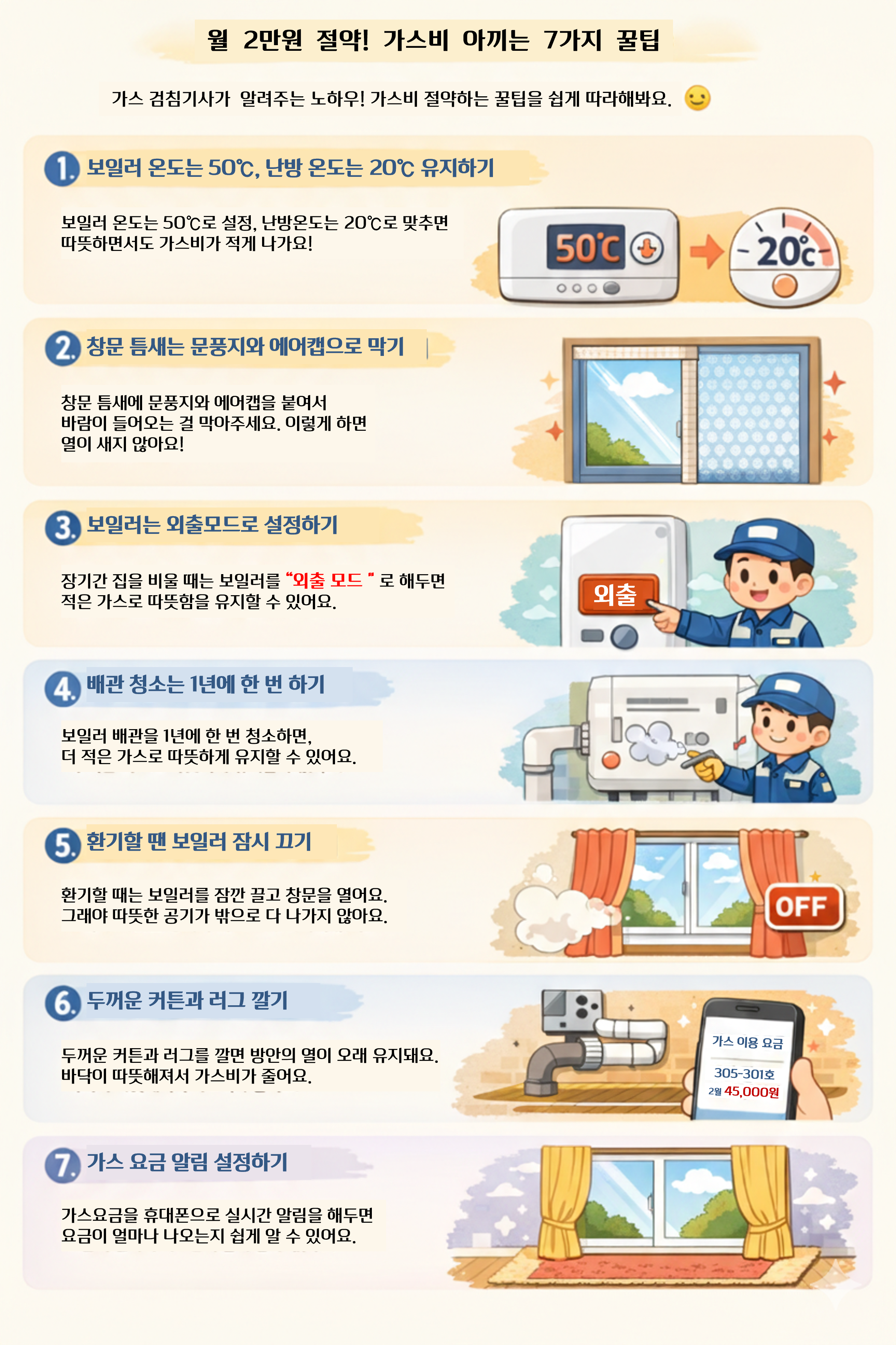 본 콘텐츠는 일반적인 생활정보 제공을 목적으로 하며, 특정 브랜드, 제품, 기업과의 관계가 없어요. 사용자의 주거 환경이나 보일러 모델, 지역 조건 등에 따라 실제 절약 효과는 다를 수 있으며, 보다 정확한 정보는 해당 지역의 가스공사나 전문 기사를 통해 확인해 주세요.