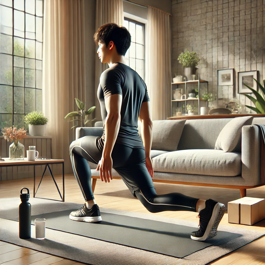런지는 허벅지와 엉덩이 근육을 강화하는 효과적인 운동입니다. 한 발을 앞으로 내딛고 뒤로 남은 다리는 무릎이 바닥에 닿기 직전까지 내리는 동작을 반복합니다. 런지를 할 때는 몸의 중심을 유지하고, 허리를 곧게 펴는 것이 중요합니다. 런지는 양쪽 다리를 번갈아가며 10회씩 3세트를 기본으로 시작할 수 있습니다.