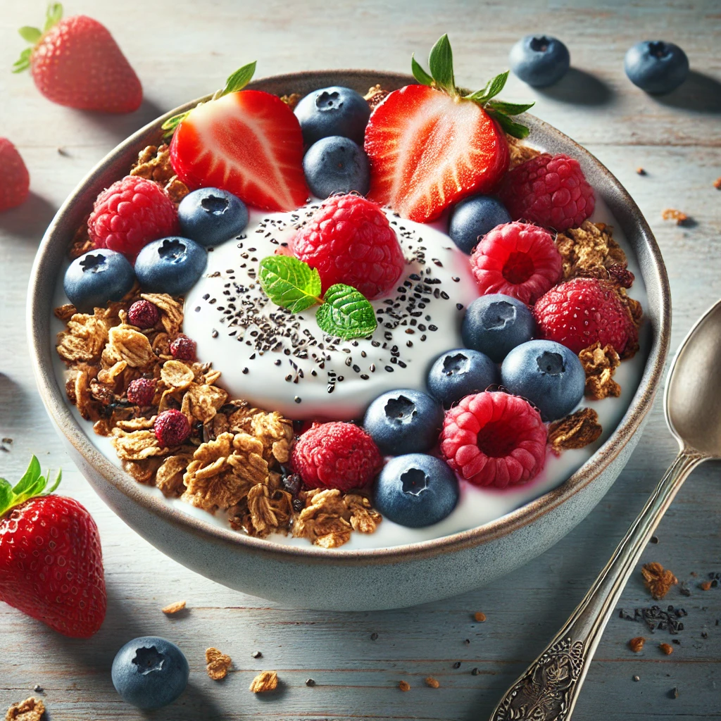 - 베리류를 얹고, 아몬드 슬라이스와 꿀(또는 메이플 시럽)을 뿌려 마무리합니다.