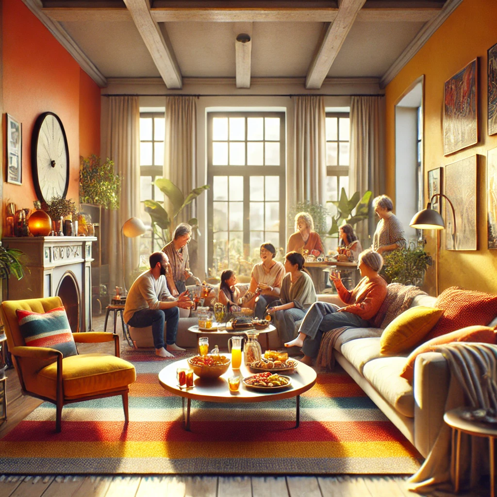 가족과 친구가 함께 시간을 보내는 거실은 따뜻하고 활기찬 색상을 통해 화목한 분위기를 조성하는 것이 좋습니다.