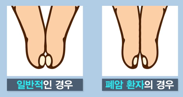 최근 영국 암 연구소에서 발표한 ‘핑거 클러빙’은 폐암 환자들에게 나타나는 현상을 이용한 자가진단법인데요. 양쪽 검지를 손톱이 마주 보도록 맞댄 후, 손톱이 시작하는 부분 사이에 다이아몬드 모양이 생기지 않으면 폐암에 걸렸을 가능성이 있다고 합니다. 또, 폐암뿐만 아니라 기관지염, 심장 질환 등의 전조증상이기도 한데요. 이 현상이 나타나는 정확한 원인은 밝혀지지 않았지만, 악성 종양으로 폐가 산소가 부족해지면 손끝이 부풀어 오르기 때문으로 추측하고 있으며, 실제 폐암 환자의 35%에서 이런 증상이 나타난다고 합니다. ( 출처:한국건강관리협회)