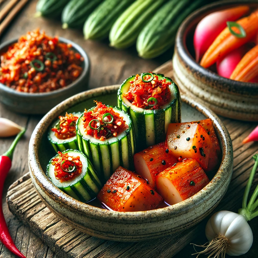 김치볶음밥과 떡갈비에 어울리는 반찬으로 오이소박이와 깍두기를 곁들여보세요. 매콤하면서도 시원한 맛이 김치볶음밥의 기름진 맛을 중화해 주며, 떡갈비와도 궁합이 잘 맞습니다.