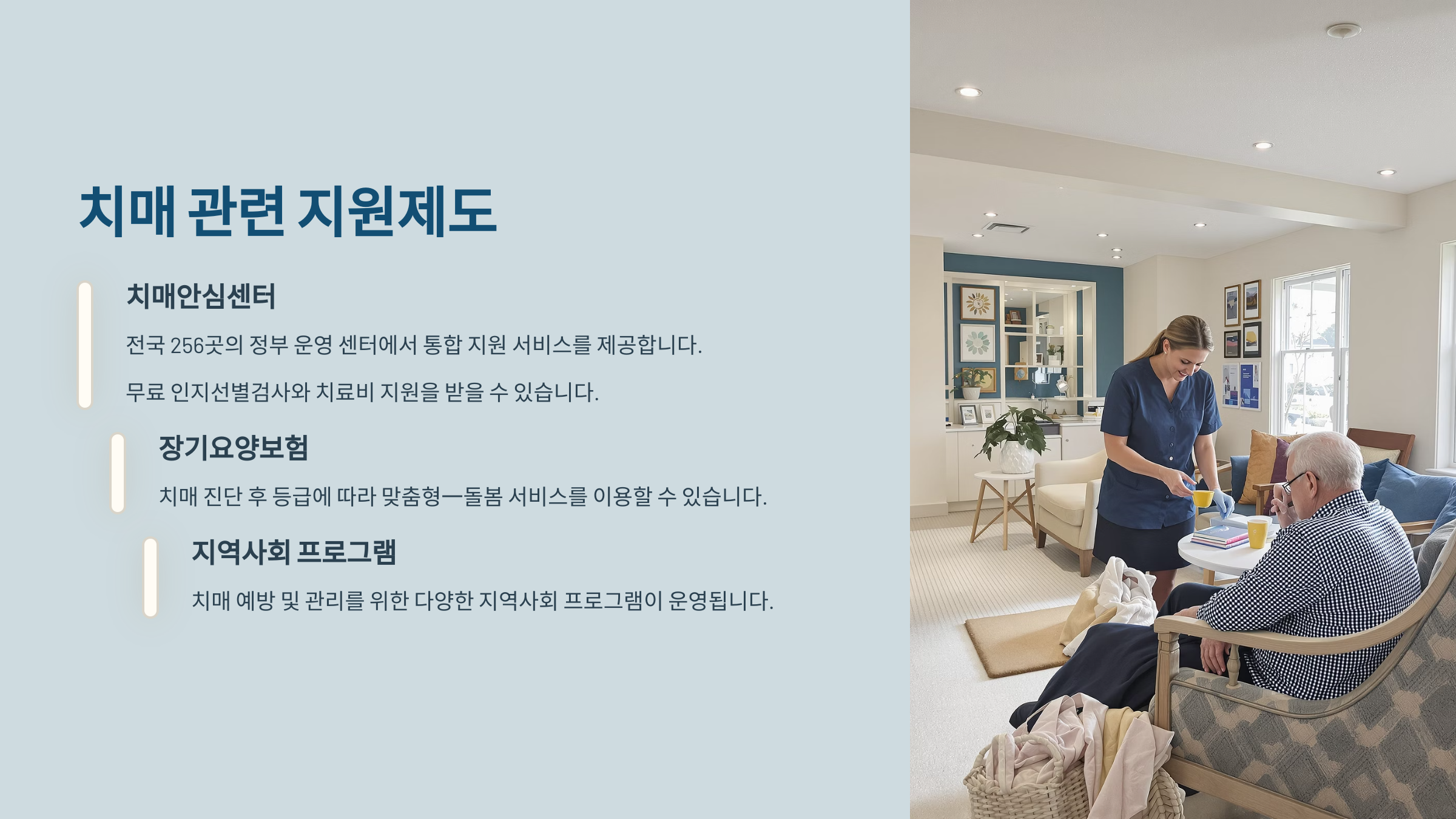 치매는 개인만의 문제가 아니에요. 사회적으로도 함께 대응해야 하는 과제죠. 그래서 국가에서는 조기 치매 환자와 가족들을 위한 다양한 지원제도를 운영하고 있어요.