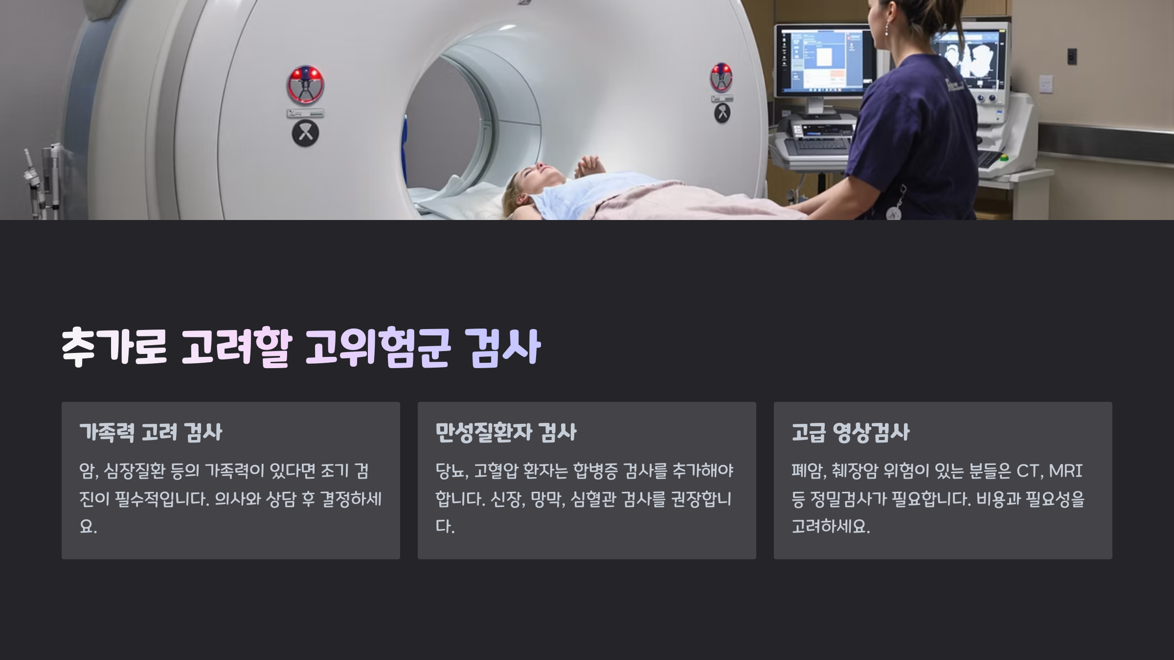 가족 중에 암 환자가 있었거나, 당뇨병이나 심혈관질환으로 치료받고 있다면 꼭 해당 분야의 정밀 검사를 추가로 받아보는 것이 좋아요.