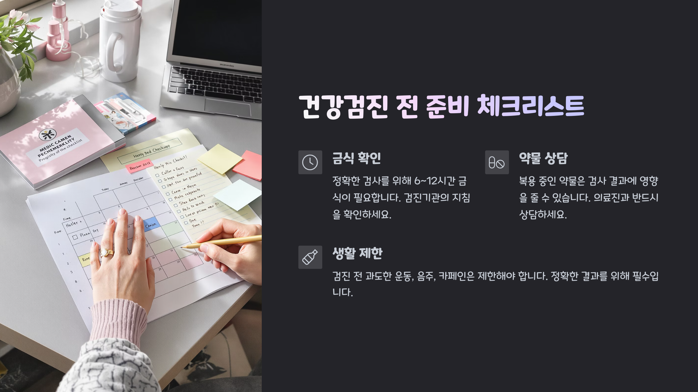 검진 전날부터 검진 당일까지의 일정은 규칙적으로 관리하는 게 좋아요. 준비가 부족하면 일부 검사가 연기되거나 부정확할 수도 있거든요.