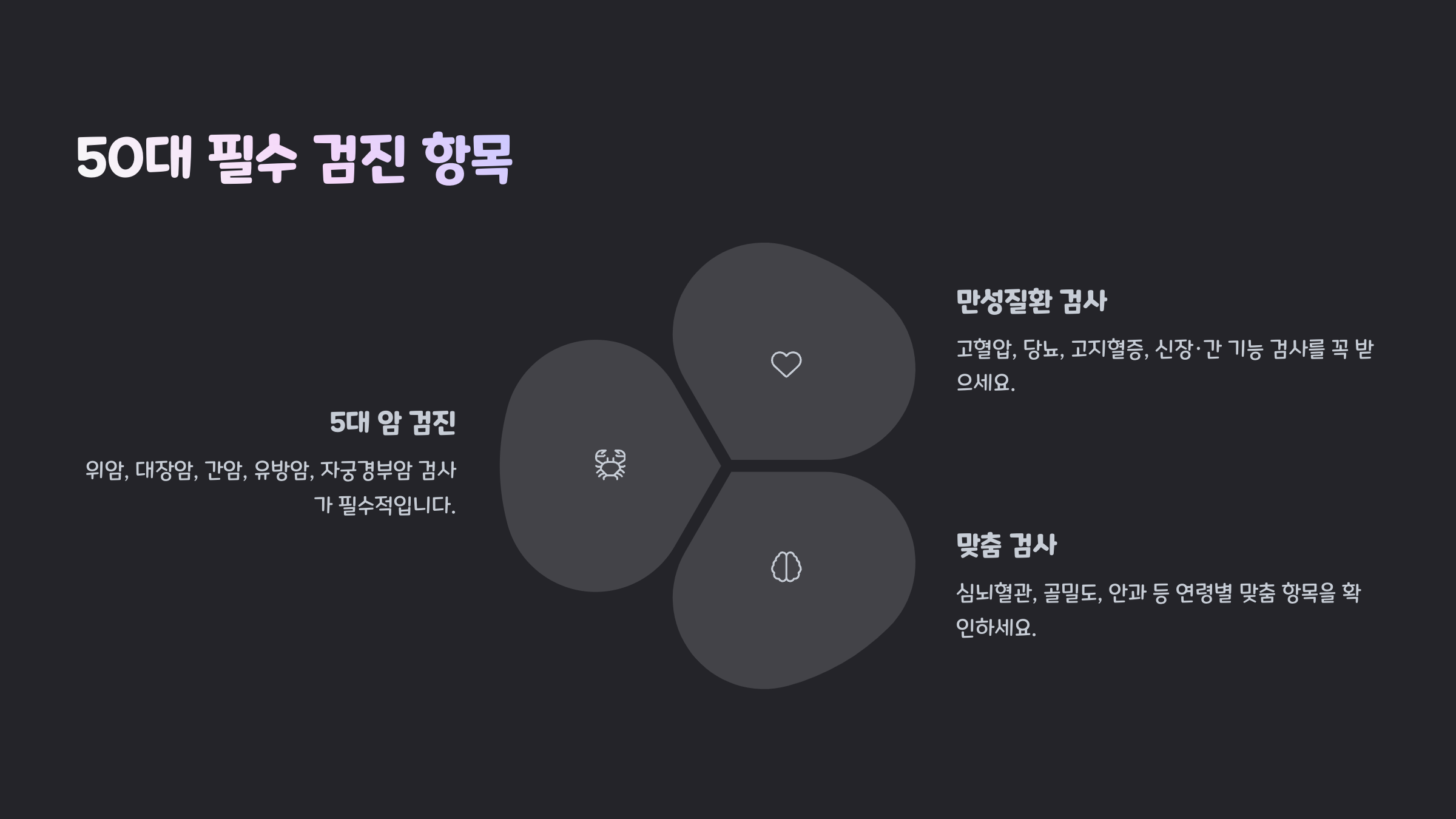 특히 50대에는 심혈관 질환, 당뇨병, 고혈압, 고지혈증 같은 만성질환이 발현되거나 악화될 위험이 커요. 이 시기를 놓치면 치료가 늦어져 삶의 질이 크게 저하될 수 있어요.